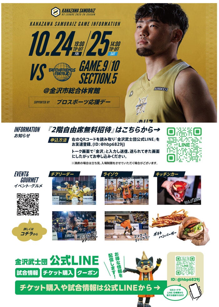 10月24日(金)、25日(土)の金沢市総合体育館にて開催されるB3リーグ第5節 アースフレンズ東京Z戦は「金沢市プロスポーツ応援デー」として開催することが決定しました。
