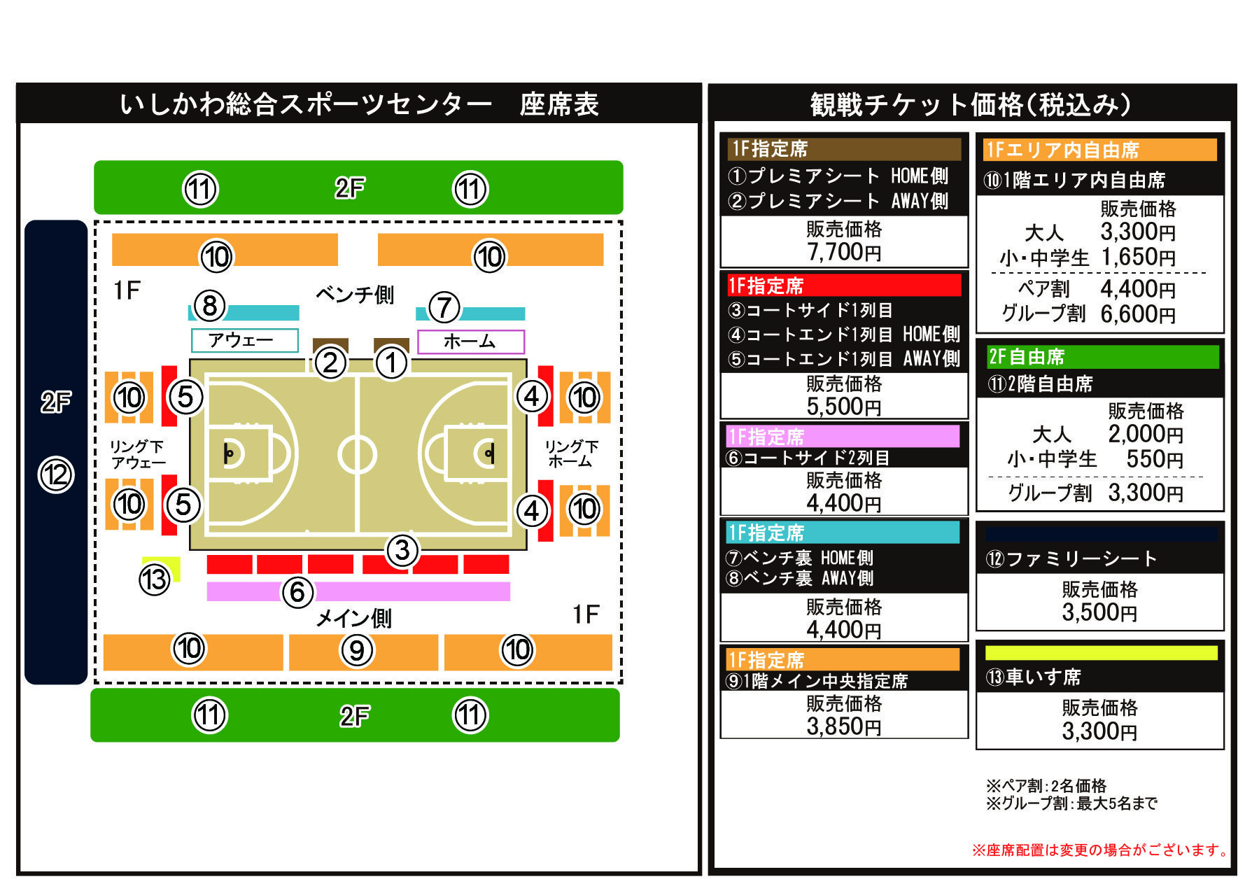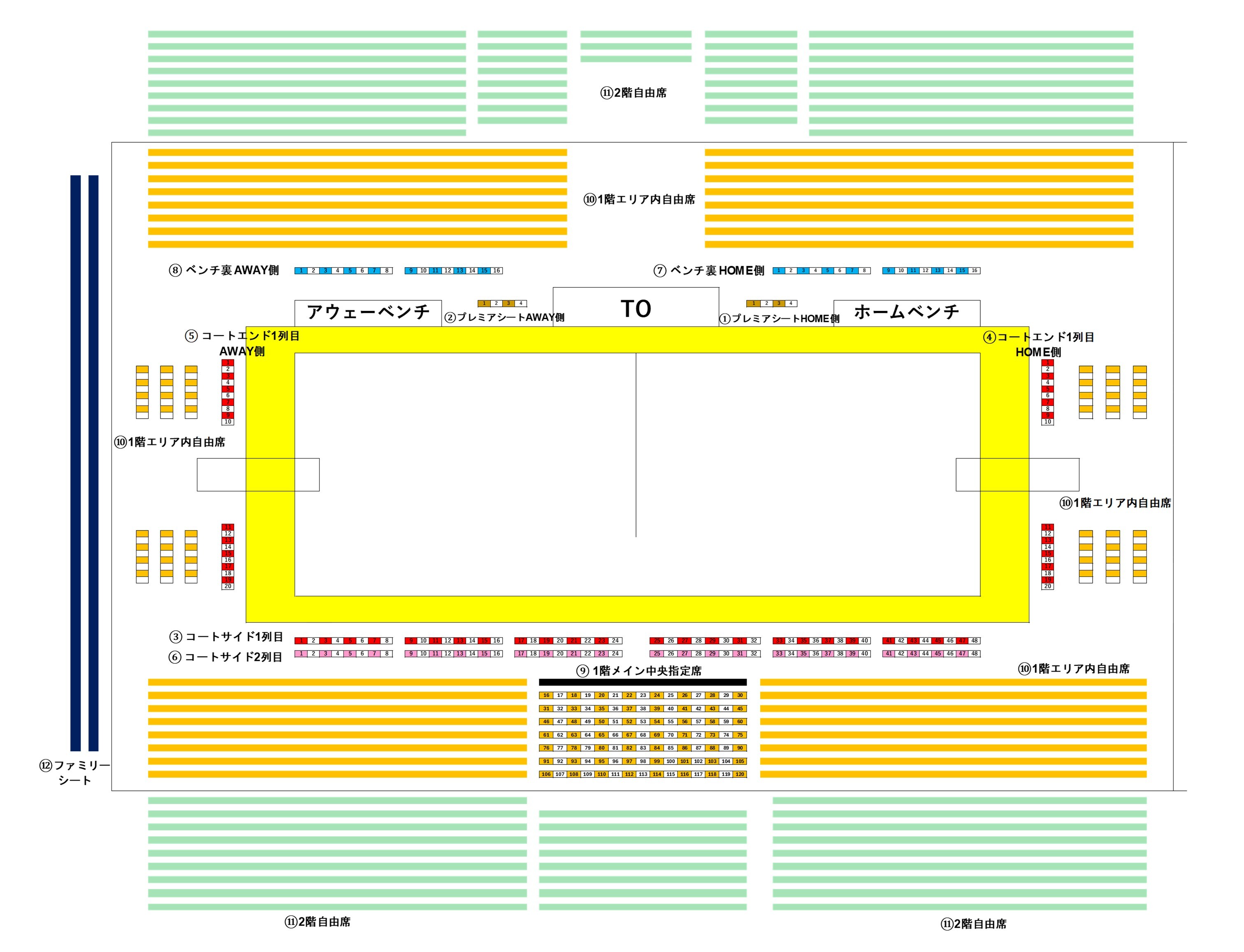 ※小松市末広体育館はレイアウトの都合上、ファミリーシートおよび1階メイン中央指定席の設置はございません。