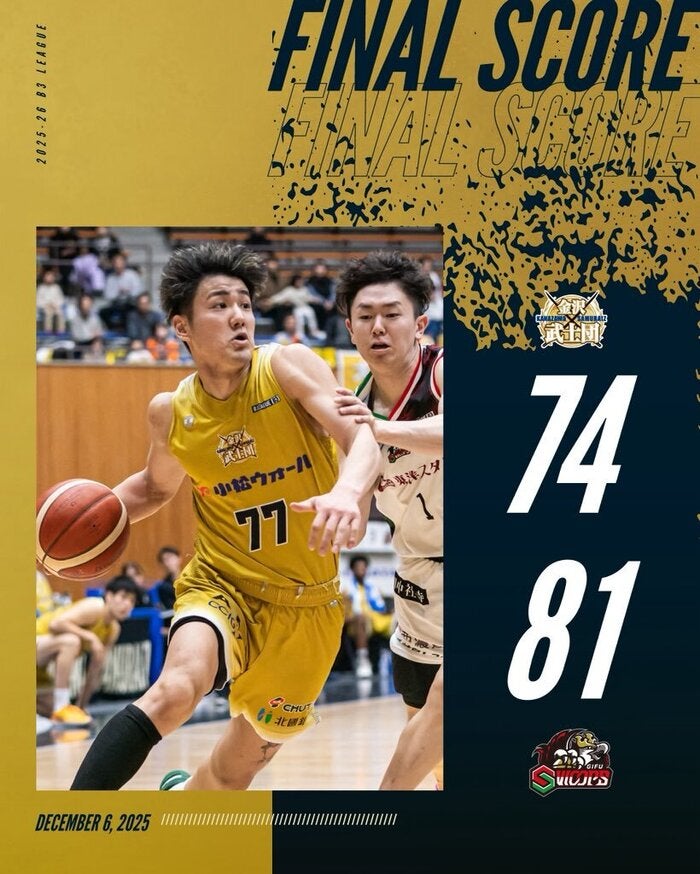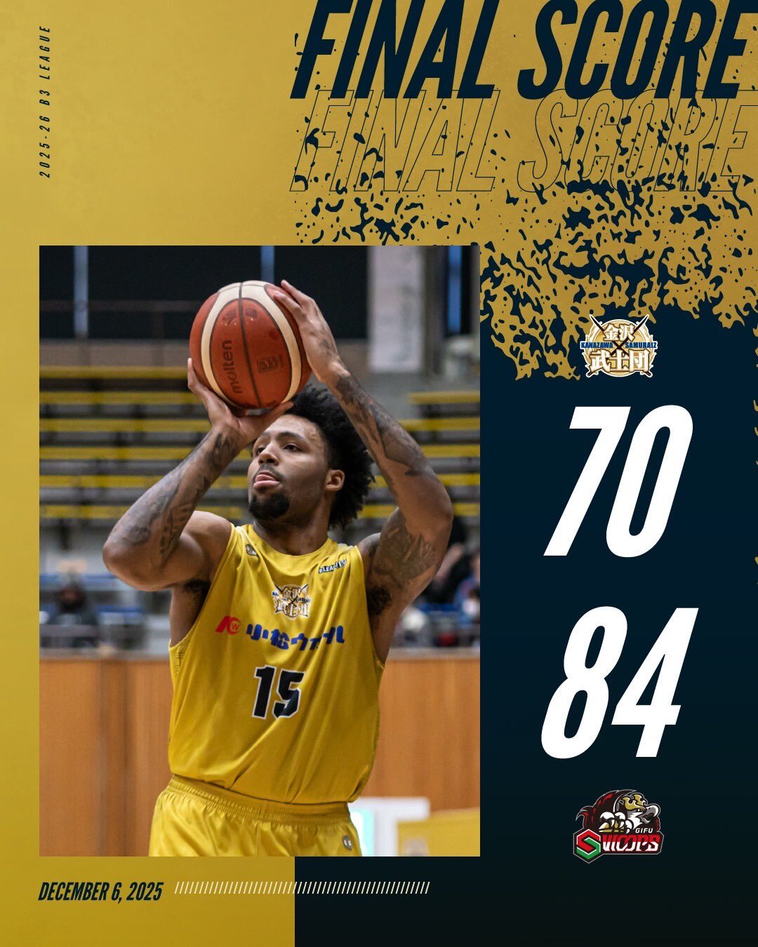 岐阜は果敢なペイントアタックから4Qだけで18本のフリースローを得る。決まったのは10本のみだが、この得点を中心に徐々にサムライズは突き放される。苦しい中でも、サムライズは#15 KJアレンのダンクシュートや、#77 松尾のアシストから#16 満尾が3Pシュートを決めて追い上げムードを作る。だが、すぐさま相手にも決め返され点差が縮まらない。消極的なプレーからターンオーバーも出てしまい、最後まで追いつけずに敗戦。