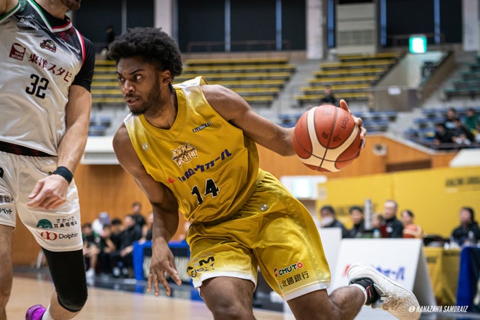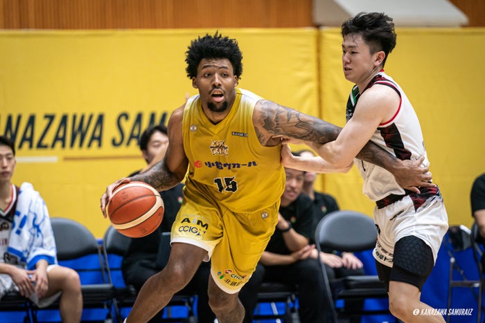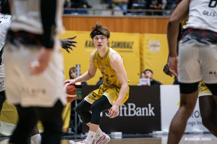 #15 KJアレンが果敢なペイントアタックを見せ、タフショットや獲得したフリースローを確実に決め得点を重ねる。一方の岐阜も、金沢から移籍した髙橋の3Pシュートや、プレストンのインサイドからの得点で追い上げ、互角の戦いで前半を終える。
