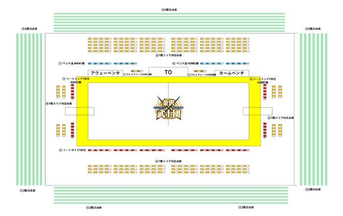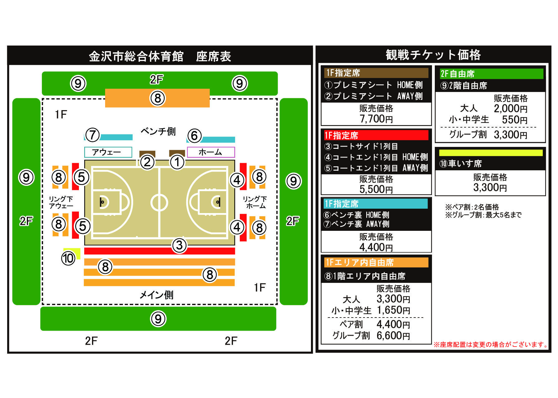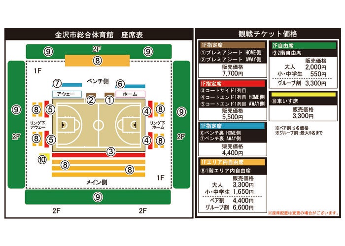 ※金沢市総合体育館はレイアウトの都合上、ファミリーシートおよび1階メイン中央指定席の設置はございません。