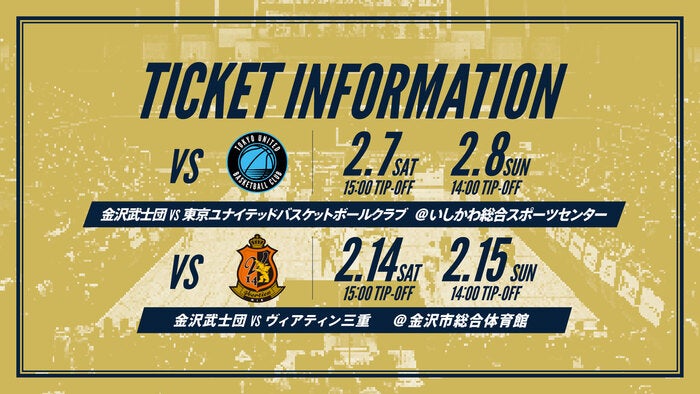 金沢サムライズでは、第19節VS東京ユナイテッドバスケットボールクラブ戦および第20節VSヴィアティン三重戦のチケット販売について、下記の概要にて販売を開始いたしますのでお知らせいたします。