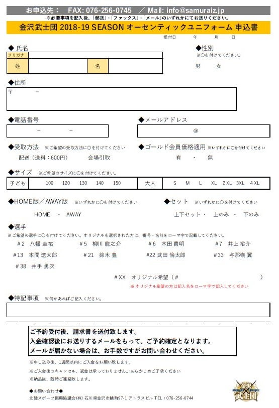 金沢武士団では、2018-19シーズン オーセンティックユニフォームのご注文受付を8/6(月)12:00より開始いたしますのでお知らせいたします。
