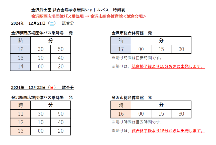 試合当日は、金沢駅西広場団体バス乗降場と金沢市総合体育館〈 試合会場 〉を結ぶ無料シャトルバスを運行いたします。
