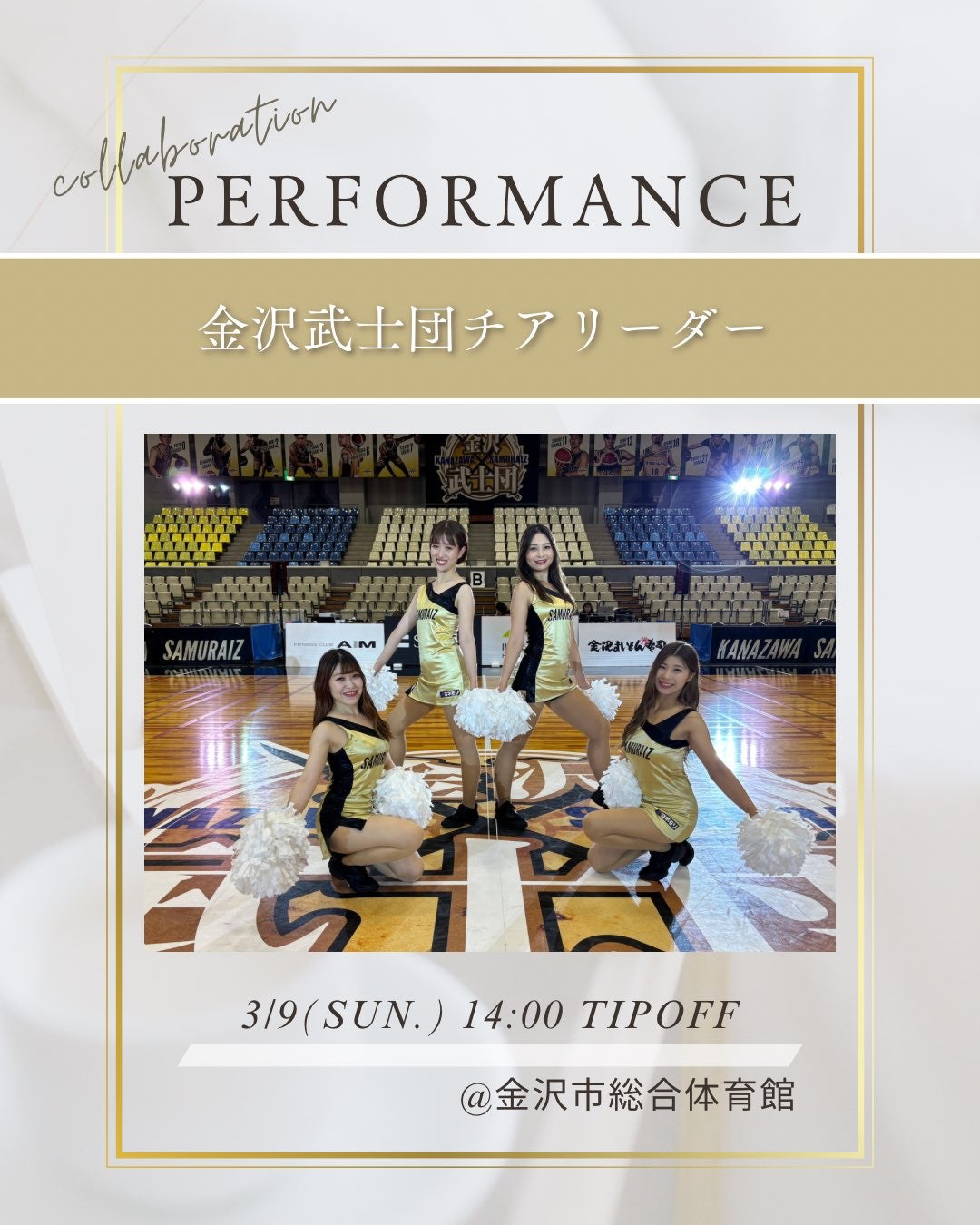 金沢武士団チアリーダーを含む全8団体が出演。総勢100名を超えるチアリーダーたちが集結し、ハーフタイムを黄色い声援の渦に巻き込みます。この機会をお見逃しなく!🌸💃