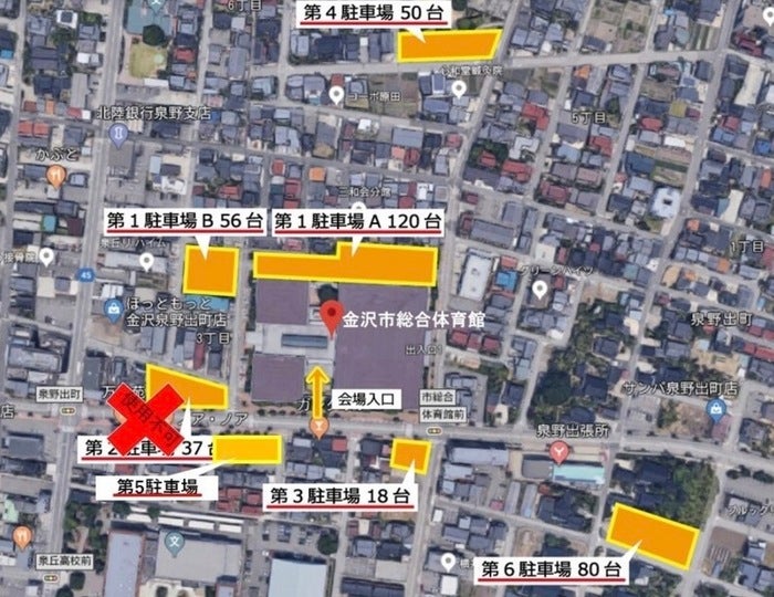 ※ ➀金沢市総合体育館駐車場は満車が予想されるため、下記 ➁金沢南総合運動公園・暫定駐車場のご利用をお勧めいたします。